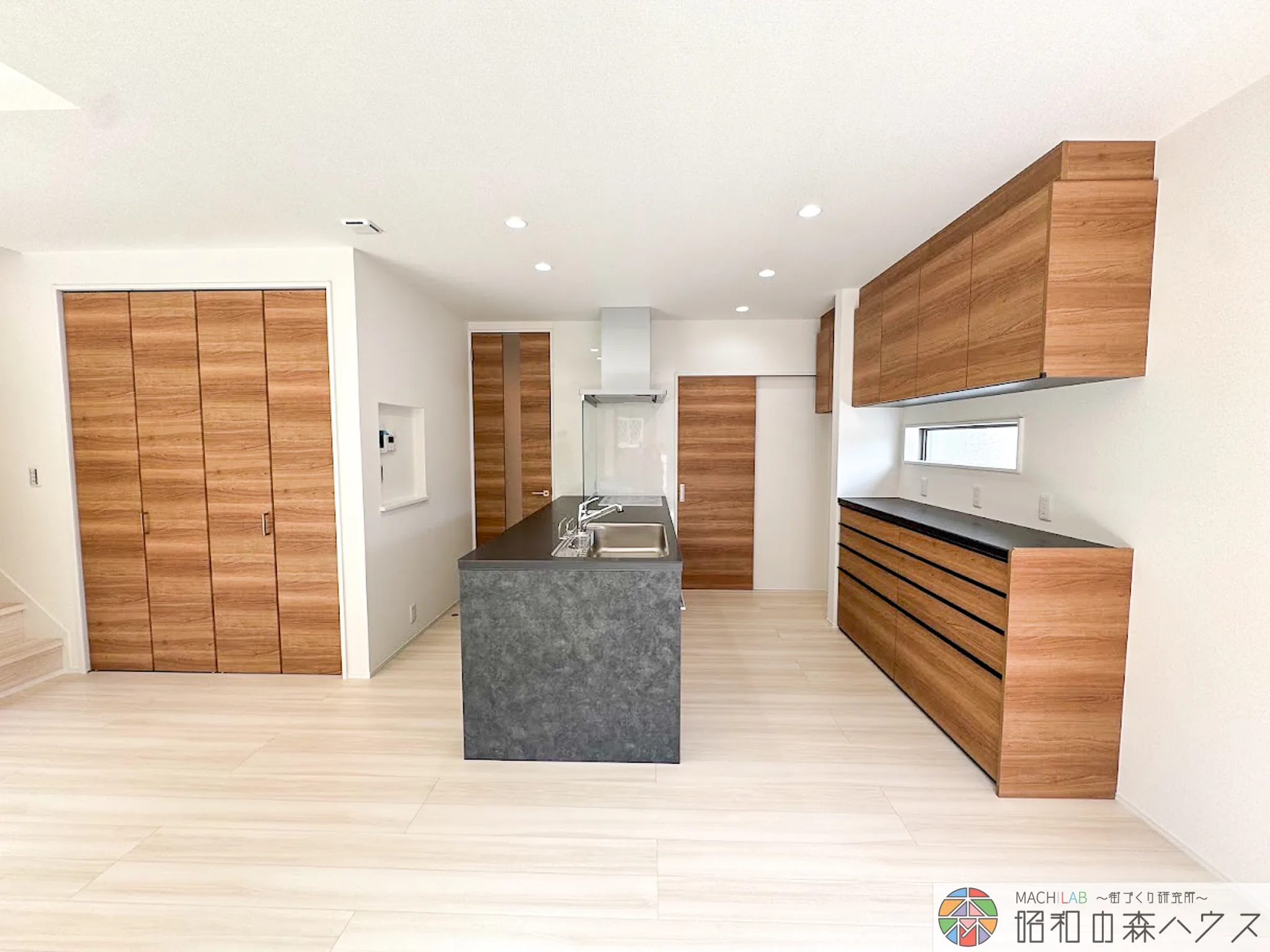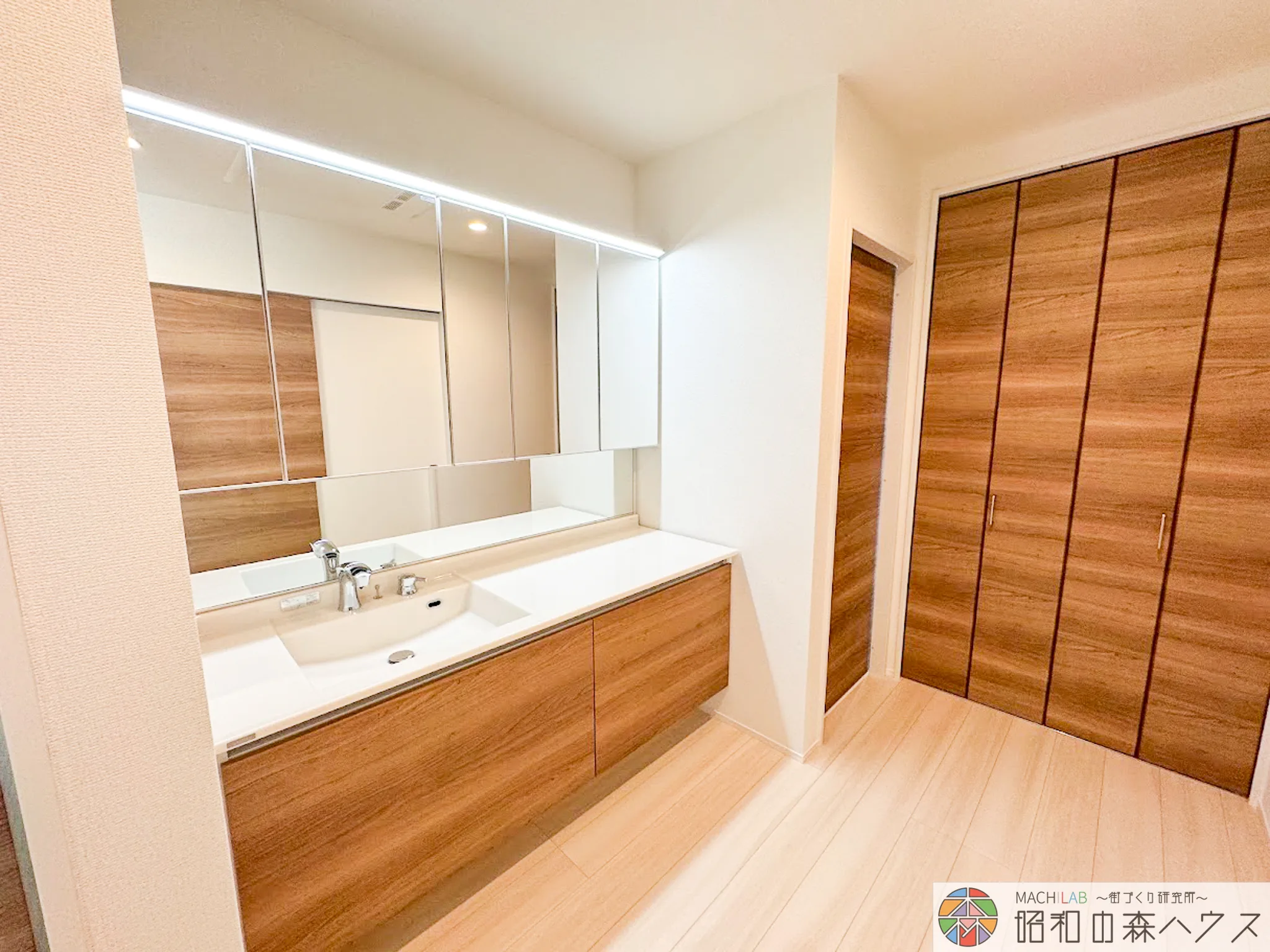 大きい洗面台、アイランドキッチン、大型食洗機、お客様のご要望に寄り添い完成した新築住宅です。